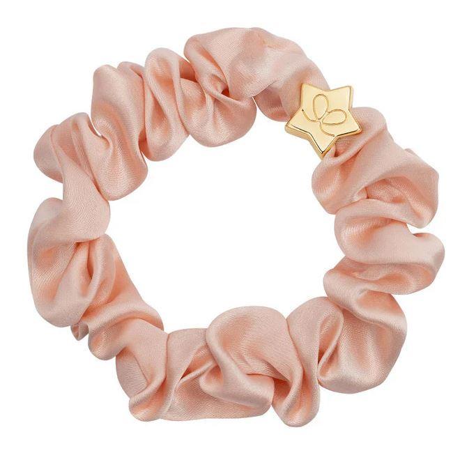 von byEloise aus London. Elastische Scrunchie aus reiner Maulbeer-Seide mit goldenem Herz - entweder als stylisches Armband oder schickes Accessoire im Haar zu verwenden