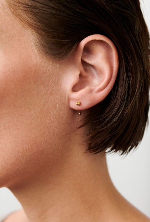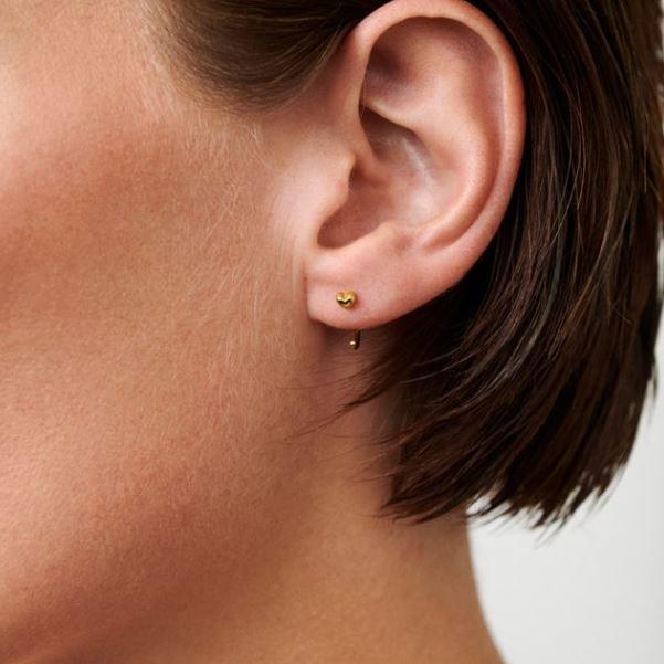 Das kleine, herzförmige Schmuckstück von Pernille Corydon blitzt dezent am Ohr hervor. Das Herz hat einen Durchmesser von 3,5 mm, die Creolen selbst von 9 mm.
